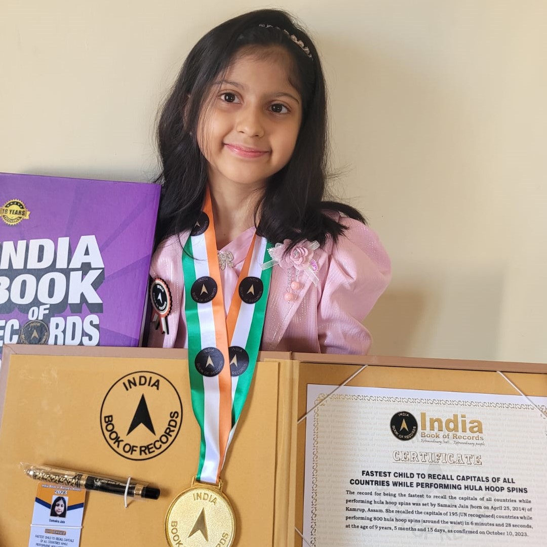 The record for being the fastest to recall the capitals of all countries while performing hula hoop spins was set by Samaira Jain (born on April 25, 2014) of Kamrup, Assam. She recalled the capitals of 195 (UN recognised) countries while performing 800 hula hoop spins (around the waist) in 6 minutes and 28 seconds, at the age of 9 years, 5 months and 15 days, as confirmed on October 10, 2023.