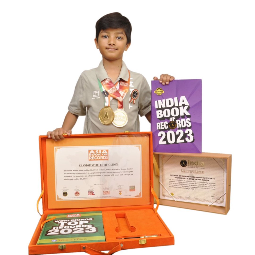 The record for recalling the maximum number of countries’ geographical epithets in one minute was set by Shivansh Bansal (born on May 12, 2015) of Delhi. He recalled 54 countries’ geographical epithets in one minute, by viewing the names of the countries on a laptop screen, at the age of 8 years and 19 days, as confirmed on May 31, 2023.